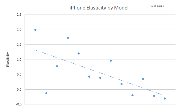 Fijémonos en uno de sus productos estrella, el iPhone. Los primeros modelos de iPhone empezaron con una elasticidad de precios de 2 (considerados elásticos) y con el tiempo ha ido bajando. La mayoría de modelos ha acabado con una elasticidad de precios por debajo de 1.