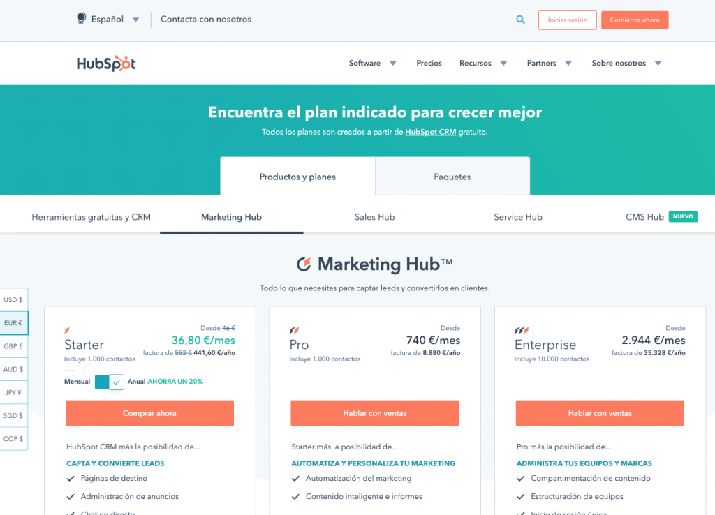 Otros competidores de Marketo, como ActiveCampaign o Hubspot, sí que muestran sus precios de forma transparente en la página web:
